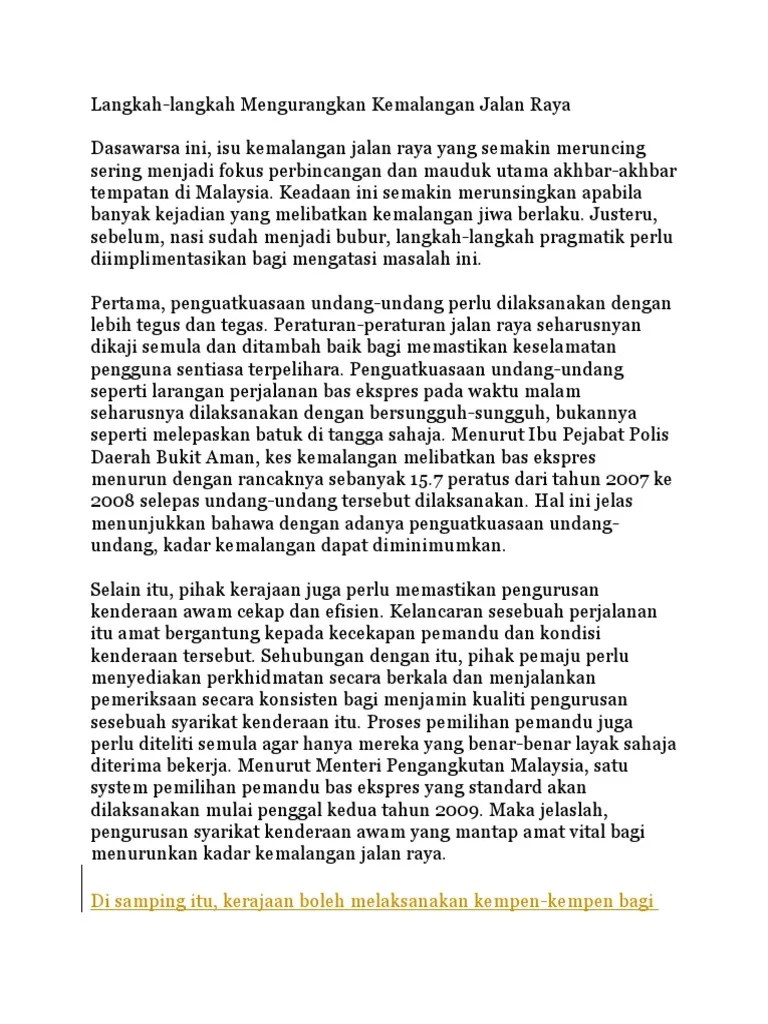 Malah dek kelajuan memandu, mereka tidak sempat untuk membaca ungkapan tersebut. Beberapa langkah patut diambil dengan segera untuk mengurangkan kemalangan jalan raya. Kemalangan jalan raya pasti dapat dikurangkan jika sikap pemandu . Isu kemalangan jalan raya sukar untuk diatasi, namun kerajaan perlu mengambil langkah yang . Bak kata pepatah berat sama dijinjing, ringan sama dipikul. Peranan media massa dalam mempengaruhisikap pengguna jalan raya memang tidak dapat dinafikan. Langkah keselamatan untuk mengelakkan kecurian kereta. Usaha untuk mendidik pemandu agar lebih berdisiplin ketika berada di atas jalan raya. Kemalangan jalan raya adalah dengan memberi didikan tentang pengetahuan dan kepentingan mematuhi peraturan Langkah utama dalam mengurangkan angka kemalangan jalan raya sudah. Memandangkan hakikat ini, semua pihak haruslah berganding bahu untuk menangani masalah ini.
